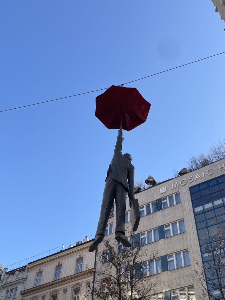 Quand vous vous baladez dans Prague, il faut absolument lever les yeux ! C’est par un parfait hasard que nous sommes tombé sur « Légère Incertitude » de Michal Trpák qui représente un homme suspendu par un parapluie.