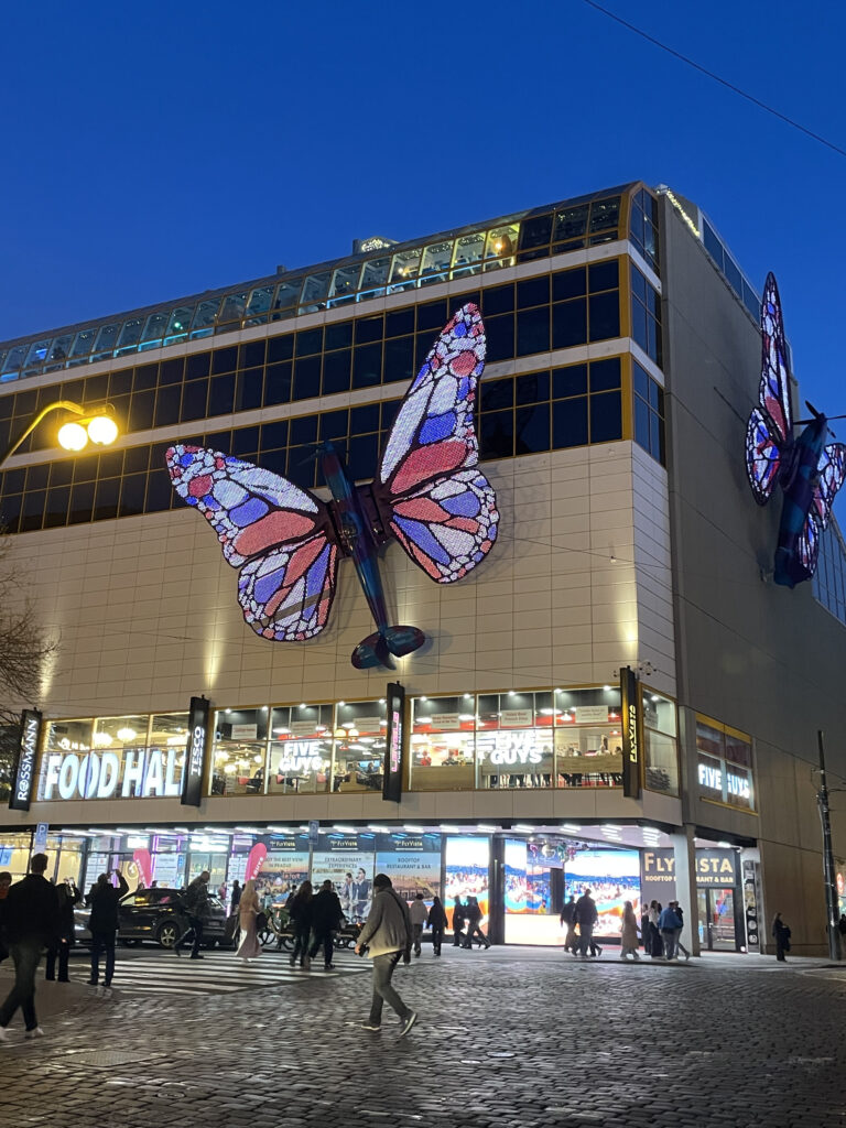 Ces avions papillons sont depuis 2024 sur la façade du centre commercial MAJ qui est a quelques pas seulement de la tête rotative de Kafka.