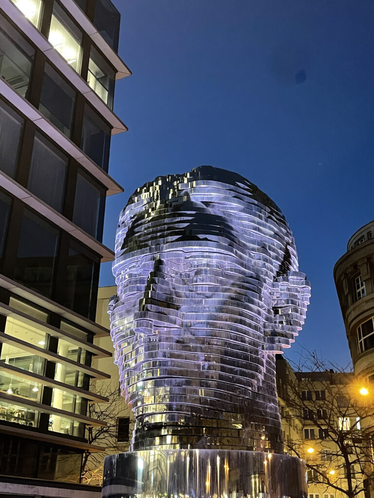 Franz Kafka est un auteur austro-hongrois du XXème siècle. Né à Prague en 1883, David Cerny lui rend hommage avec cette tête rotative le représentant.