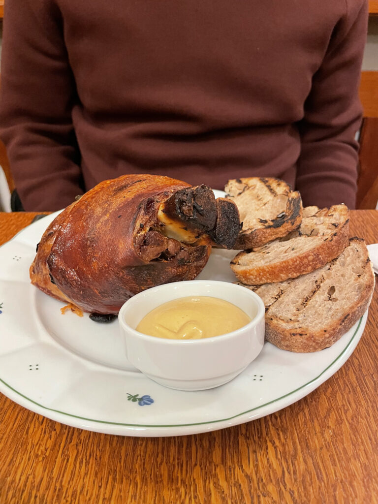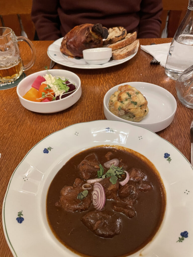 Nous avons découvert les plats typiques praguois avec ce restaurant situé dans la nouvelle ville. Pensez à réserver car, comme beaucoup de restaurants le soir, il affiche souvent complet. Thomas a prit un jarret de porc qui s’est avéré énorme. Il était accompagné d’une minuscule assiette de légumes, ce qui nous a fait rigoler. De mon côté, mon choix s’est tourné vers un goulash à la bière brune à saucer avec une boulette de pain. C’est le ventre bien rempli et ravie d’avoir eu cette expérience culinaire que nous avons quitté le restaurant. Nous avons payé 54€ pour 1 bière, 1 grande bouteille d’eau, 1 entrée, 2 plats,