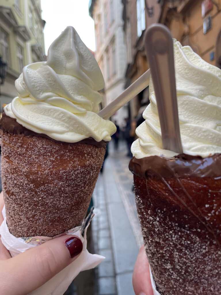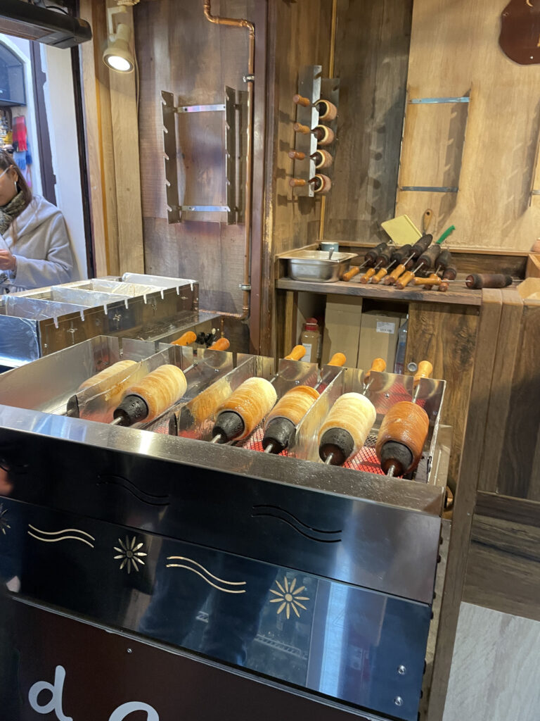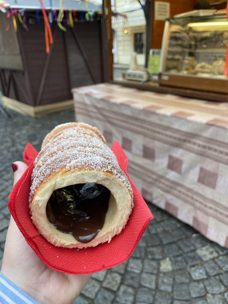 Nous sommes tombé sur un marché juste à côté où nous n’avons pas pu résister à l’envie de déguster un trdelník. C’est une pâte qui est cuite enroulée sur des cylindres en bois au dessus d’un feu alimenté par du charbon. Lors de sa cuisson, il tourne et il est enduit de lait, jusqu’à ce qu’il obtienne sa couleur dorée. Délicieux avec un peu de pâte à tartiner au chocolat !