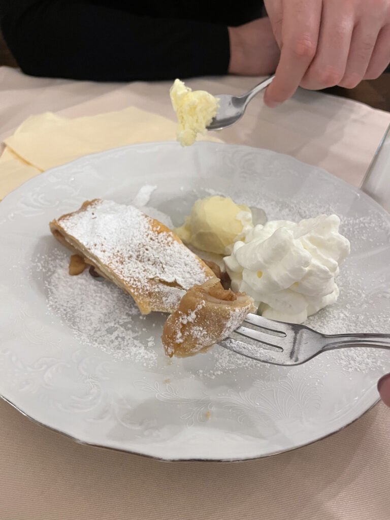 Ce restaurant aux spécialités tchèques est situé juste à côté de l’entrée Ouest du château. Nous y sommes allés par hasard et sans réservation. J’ai pris le fameux goulash épicé de boeuf à la bière accompagné de galette de pommes de terre et Thomas du canard rôti à l’ancienne avec du choux rouge et des boulettes de pâte. Nous n’avons pas résisté au Strudel à la pomme en désert. Un sans faute qui nous a permis de reprendre des forces, sans avoir le ventre trop rempli. Nous avons payé 33€ pour 2 plats, 1 grande bouteille d’eau et 1 dessert.