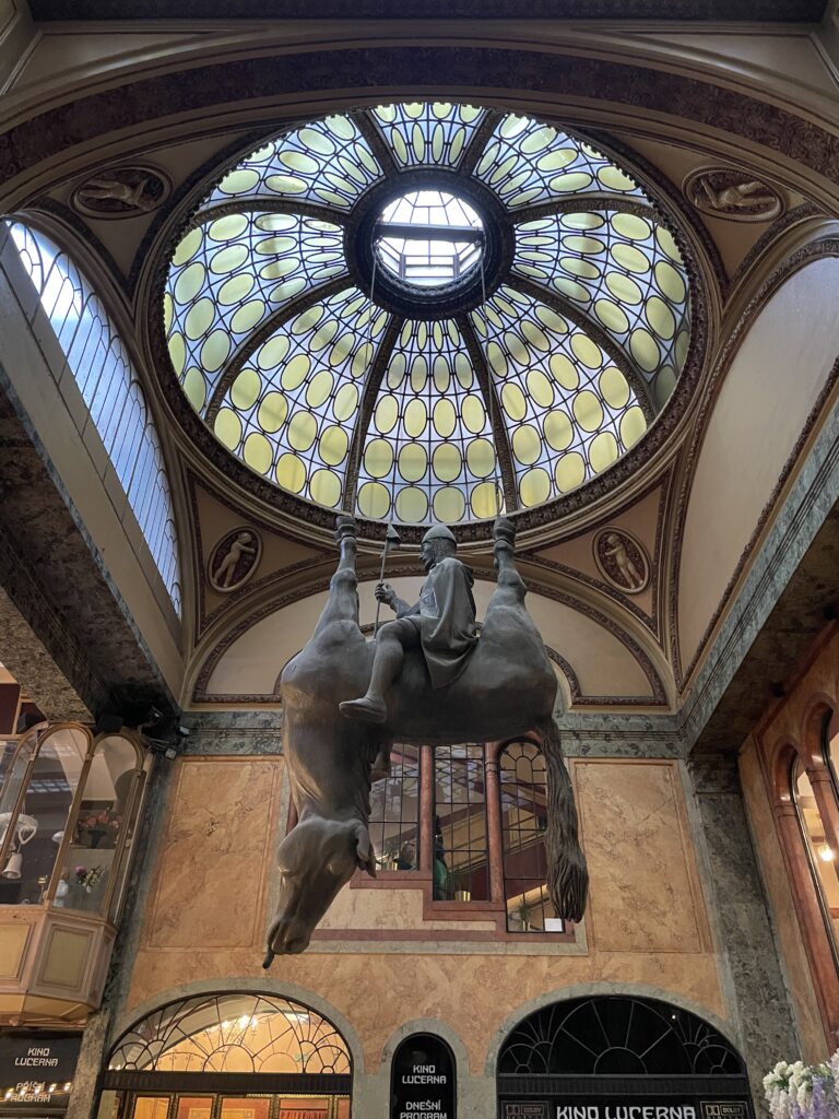 La passage Lucerna est l’un des plus connu à Prague notamment avec l’oeuvre du cheval à l’envers de David Cerny. Cette dernière représente Saint Venceslas (le même souverain que celui représenté sur son cheval Place Venceslas), assit sur le ventre de son cheval à l’envers avec la langue pendante.