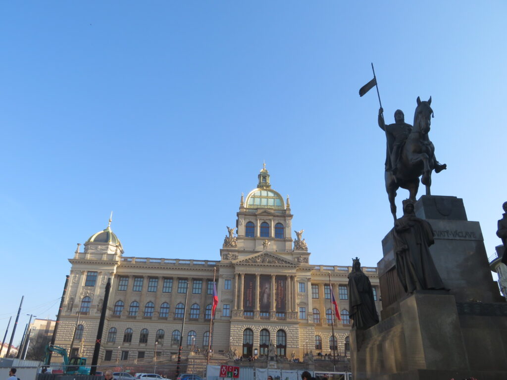 La statue du cheval de Saint-Venceslas la domine. Il s’agit du saint patron des tchèques qui fût Duc de Bohême de 921 jusqu’à sa mort.
