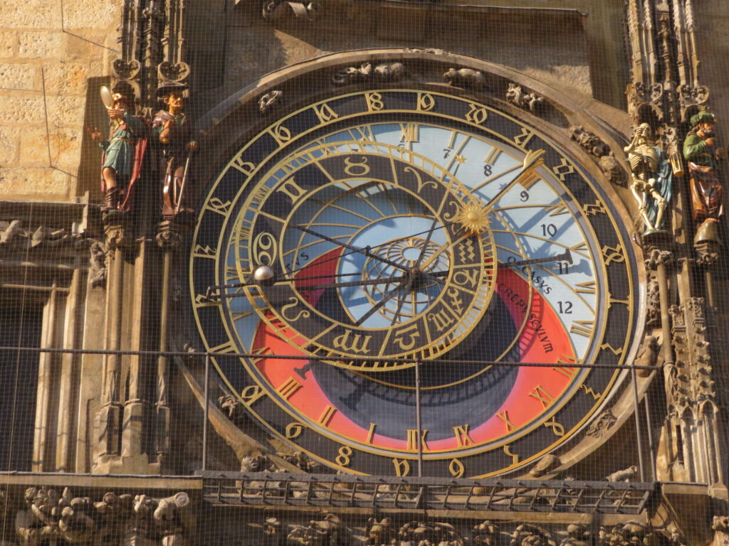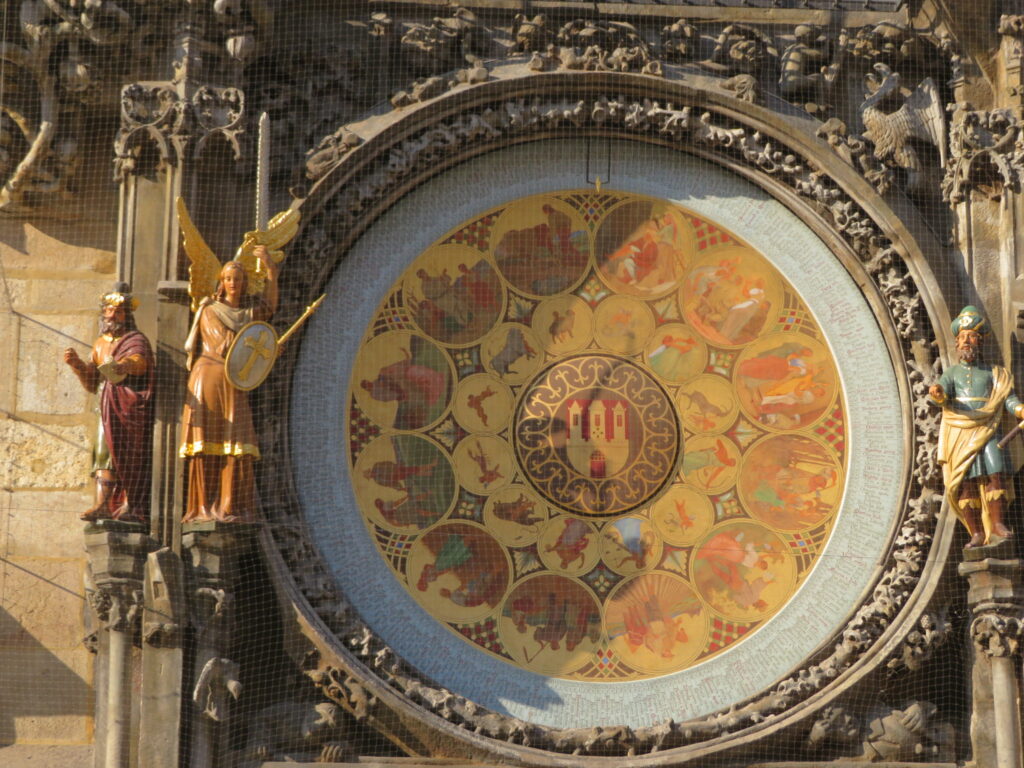 En son centre, le blason de Prague. Puis on retrouve autour les signes du zodiaques, eux-mêmes encerclés des mois de l’année illustrés par des scènes de la vie paysannes en Bohême.