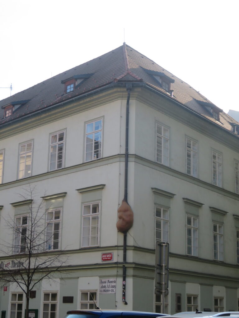 Une des œuvres les plus discrètes et fascinantes de David Černý. Si vous ne levez pas les yeux au bon moment, vous passerez devant sans même le remarquer. Fixée sur une descente de gouttière de la façade du théâtre Na Zábradlí, elle symbolise la naissance de l’art et de la création.