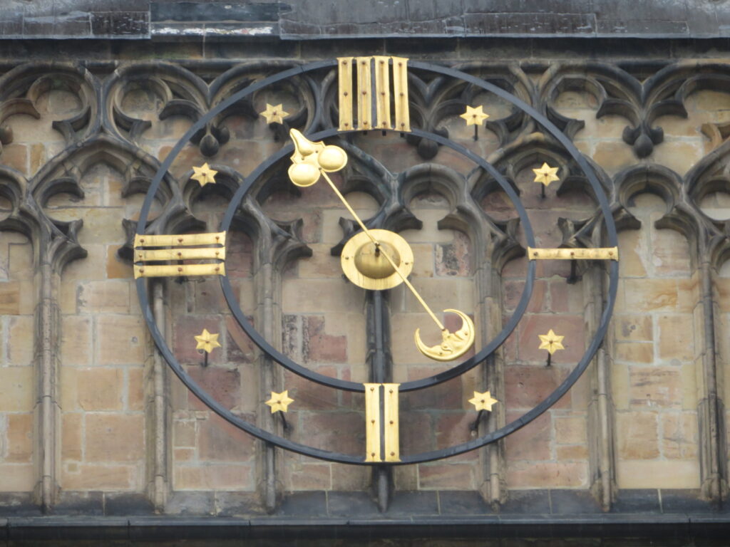 Chaque heure, elle se met à sonner. Un attroupement se forme pour observer les 12 apôtres apparaître aux deux fenêtres bleues et voir le coq, au-dessus, chanter le grand final.