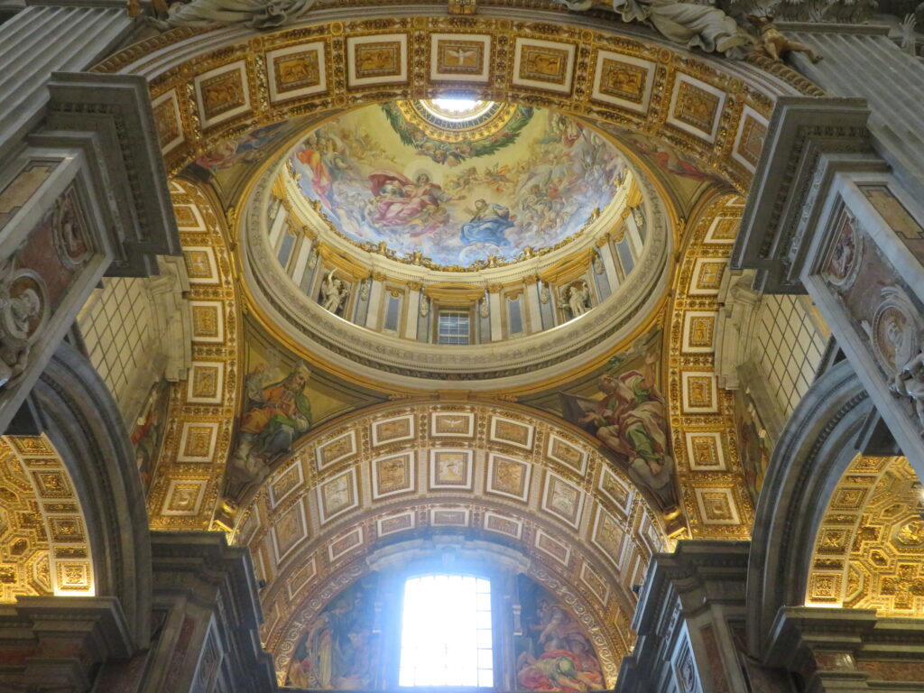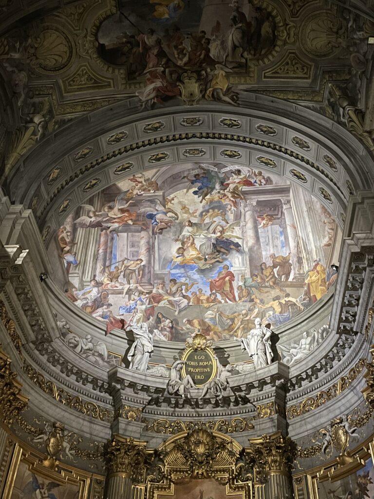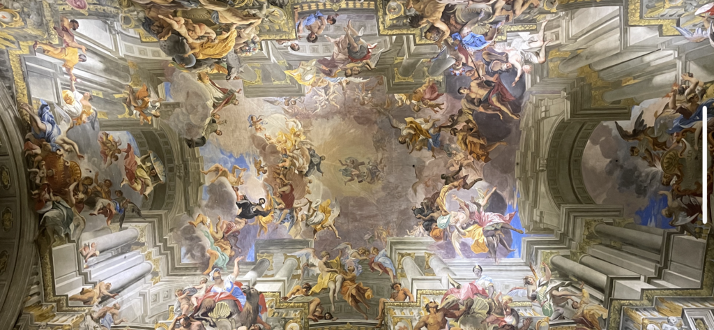 Par ailleurs, l’église a une fausse coupole. En effet, par manque d’argent à l’époque de la construction, la coupole prévue n’a jamais été bâtie. Pozzo a donc peint une toile de 13 mètres de diamètre qui, vue d’un point précis au sol, donne l’illusion parfaite d’un dôme en relief.