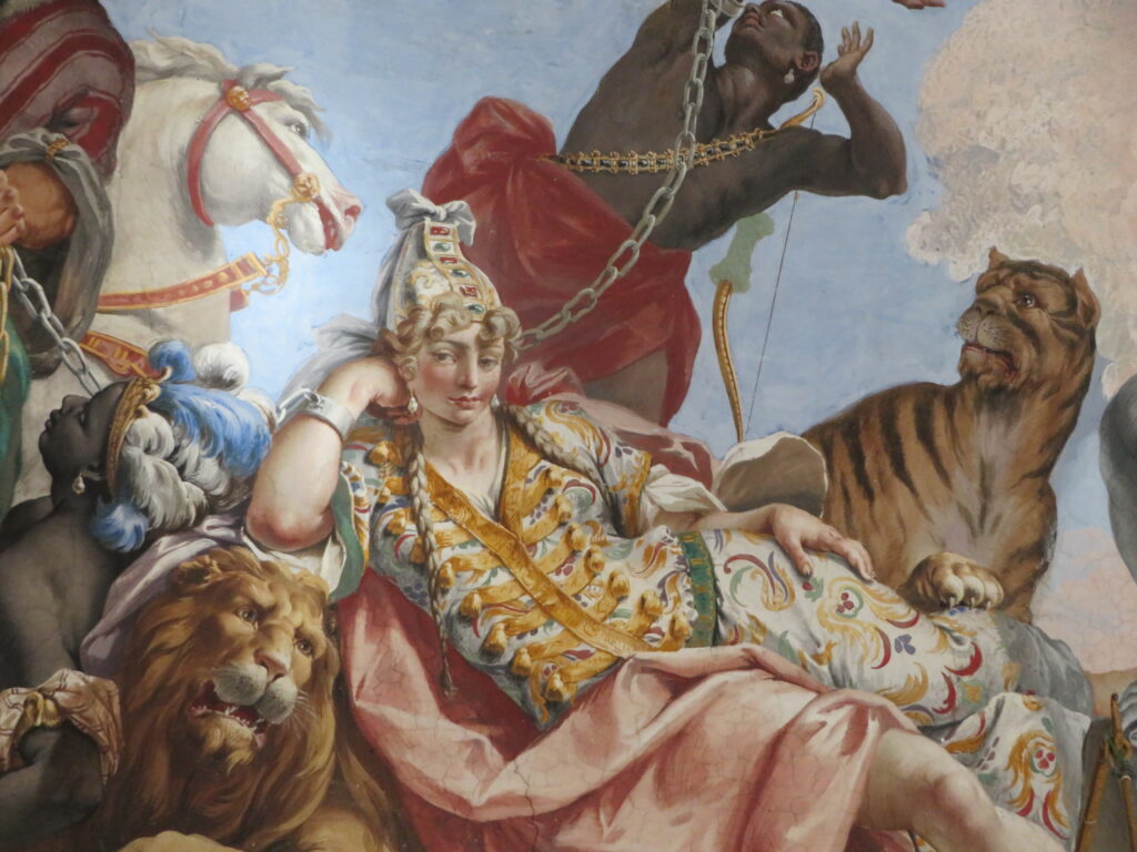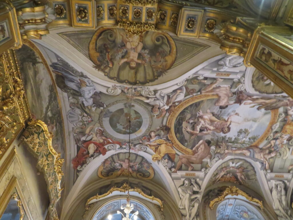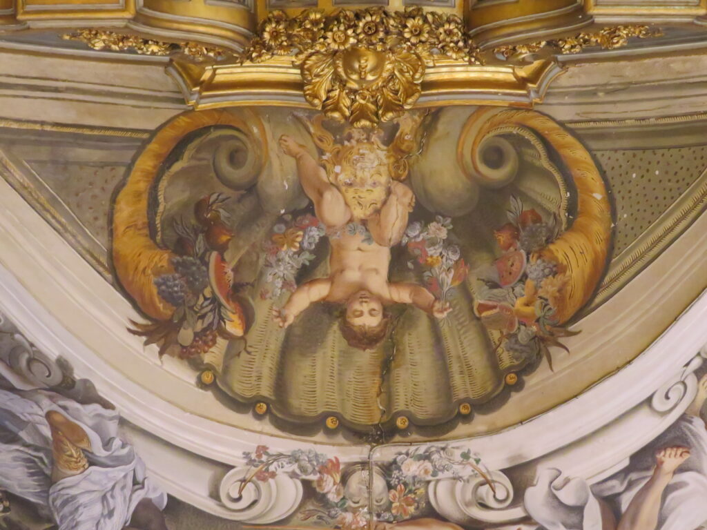 Sa voûte en trompe-l’œil est juste incroyable. Le plafond semble s’ouvrir sur le ciel. Grâce à une perspective parfaite, on a l’impression que les colonnes montent vers le haut et que des personnages s’envolent, alors que le plafond est en réalité totalement plat.