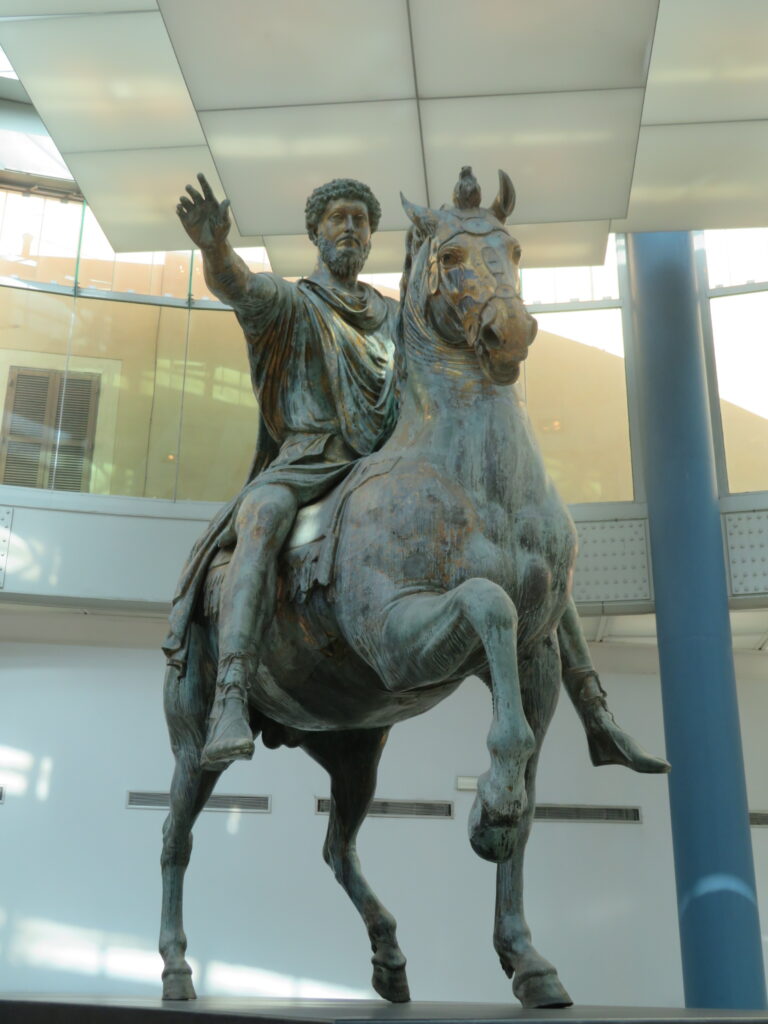 - La statue équestre de Marc Aurèle : L’originale en bronze (une copie se trouve à l’extérieur sur la place).