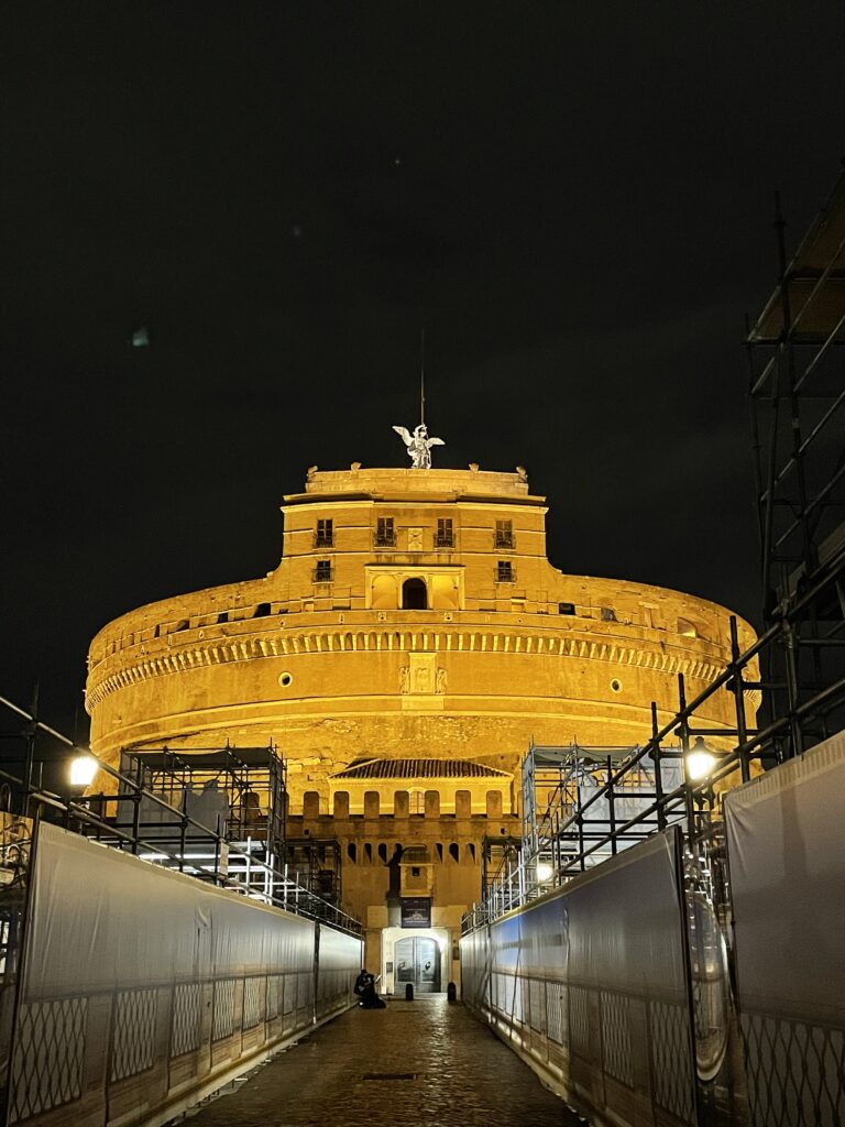 L’un des secrets les plus célèbres du château reste le Passetto di Borgo, ce couloir fortifié dérobé qui le relie directement au Vatican et permettait au Saint-Père de s’échapper en toute discrétion. Mais le véritable point d’orgue de la visite se trouve au sommet : la « Terrasse de l’Ange ». De là-haut, on profite de l’un des plus beaux panoramas de Rome, avec une vue plongeante sur le Tibre et la majestueuse coupole de la Basilique Saint-Pierre qui semble à portée de main.