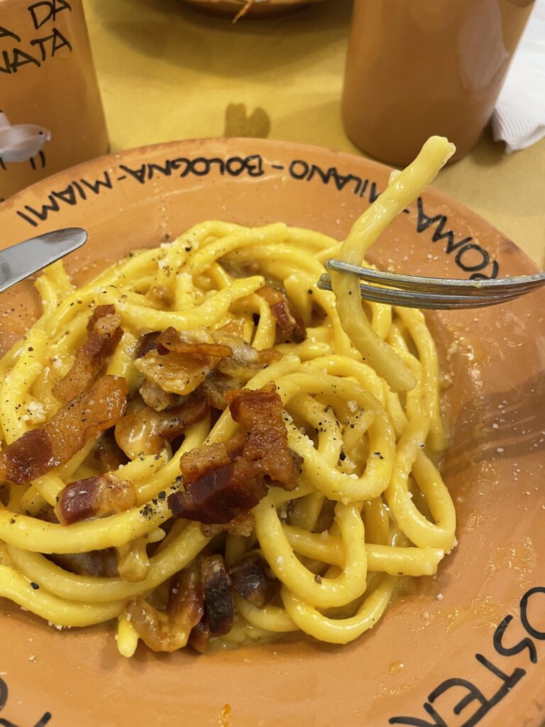 Située à deux pas de Campo de Fiori et de la Place Navone, l’Osteria da Fortunata est célèbre pour ses pâtes fraîches faites à la main. L’atmosphère est celle d’une véritable trattoria romaine, rustique et vibrante, où les classiques comme la carbonara, l’amatriciana ou la gricia sont servis en portions généreuses avec des ingrédients biologiques de haute qualité.